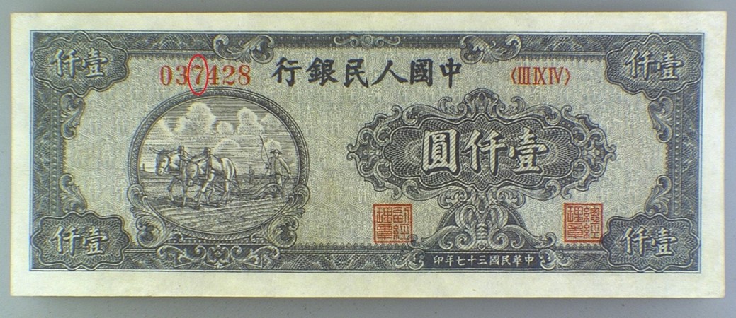 CHN810 - 1948年中国人民银行壹仟圆狭长型双马耕地