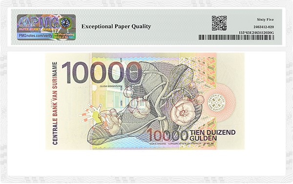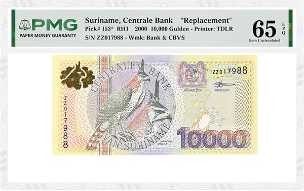 纸币方面,本场拍卖会上脱颖而出的PMG评级钞是苏里南中央银行2000年10,000盾(补号),其评级等级为PMG 65 Gem Uncirculated EPQ(拍品号1309)。此类别补号钞专门用于替换印刷出错或出现瑕疵的流通纸币。本件藏品正面以配有纹饰的鹰雕与苏里南国徽为主要图案,背面则绘有苏里南中央银行大楼。据PMG数量报告显示,目前已收录的同类别已发行纸币已有逾250张,而已收录的同类别补号钞仅有5张,此件拍品的评级等级在其中位列第一*(截至2026年4月14日的数据)。