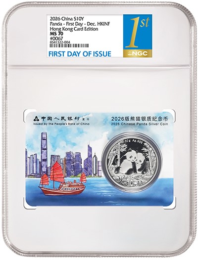 视角转向硬币拍品,本场拍卖会大放异彩的NGC评级币为2026版熊猫银质纪念币中国香港卡,评级等级为NGC MS 70(拍品号1711)。熊猫币自1982年面世发行以来,历经数十年沉淀,如今已经成为现代钱币收藏的经典品类,在全球收藏市场皆赢得颇高人气。本场拍卖会呈现的这枚城市卡版本熊猫币序列号数字较为靠前,附有“First Day – Dec. HKINF”标识,同时获评NGC评级标准下的最高分*NGC MS 70,在NGC统计中已收录的同类别硬币里堪称上乘佳品。